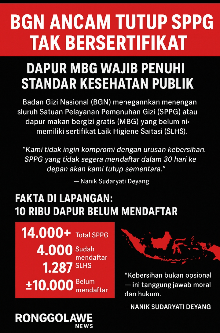 Jakarta, Ronggolawe News – Pemerintah mulai mengetatkan pengawasan terhadap dapur-dapur penyedia Makan Bergizi Gratis (MBG) di seluruh Indonesia. Melalui Badan Gizi Nasional (BGN), pemerintah menegaskan akan menutup sementara seluruh Satuan Pelayanan Pemenuhan Gizi (SPPG) yang belum memiliki Sertifikat Laik Higiene Sanitasi (SLHS).