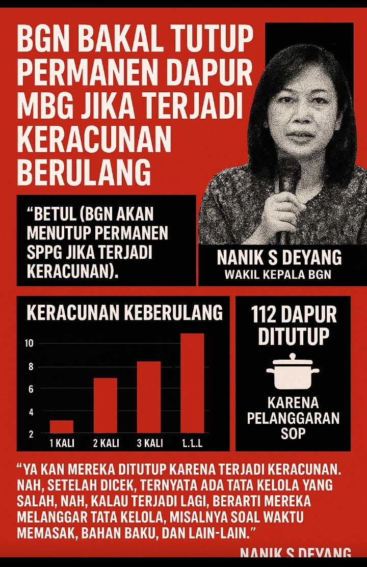 “Betul, jika terjadi keracunan berulang, SPPG akan ditutup permanen,” tegas Wakil Kepala BGN, Nanik S. Deyang, Selasa (11/11/2025).