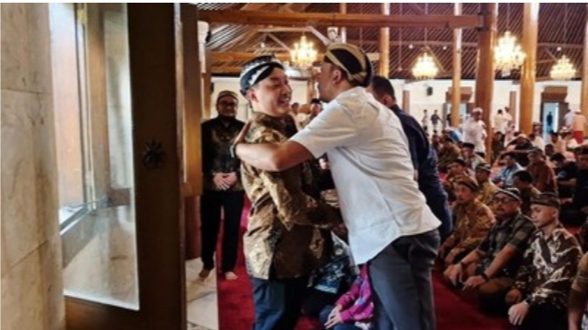 Di antara kerumunan jamaah, keduanya saling menyalami, tersenyum, bahkan berpelukan disertai cipika-cipiki—gestur langka di tengah isu perebutan legitimasi takhta yang selama ini membelah para abdi dalem dan pengageng keraton.