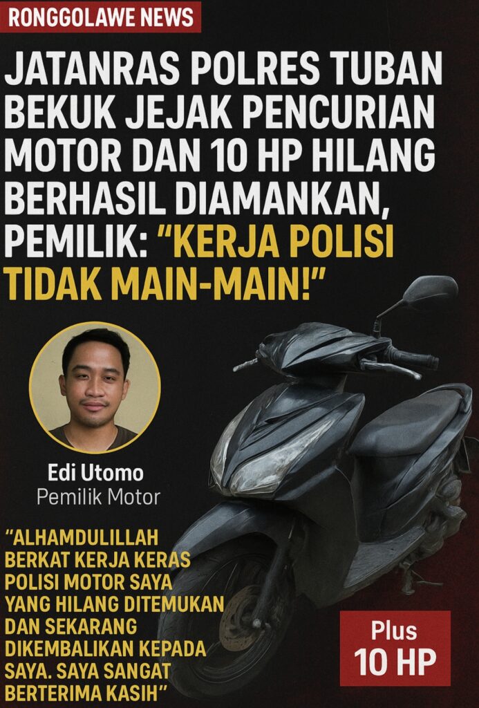 Keberhasilan mengembalikan motor dan 10 HP ini memberi harapan besar bagi masyarakat bahwa setiap laporan tidak dibiarkan mengendap. Polres Tuban, melalui Jatanras, menunjukkan bahwa keamanan publik tetap menjadi prioritas.