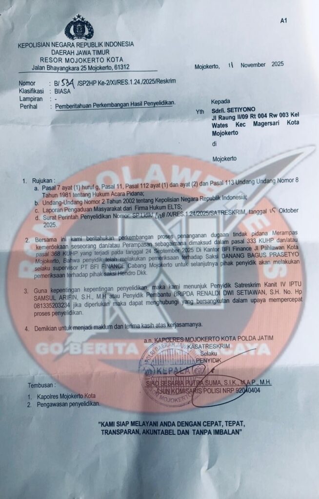 Surat bernomor B/534/SP2HP Ke-2/XI/RES.1.24/2025/Reskrim tersebut menerangkan bahwa penyidik masih melakukan pemeriksaan saksi serta pengumpulan bahan dan keterangan terkait dugaan tindak pidana Pasal 333 KUHP dan Pasal 368 KUHP yang terjadi pada 24 September 2025 di halaman kantor PT BFI Finance, Kota Mojokerto. Meski demikian, hingga hampir dua bulan laporan berjalan, perkembangan penanganan dipandang tidak menunjukkan progres signifikan.