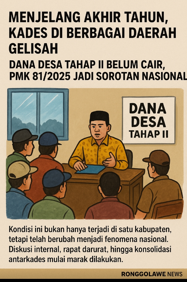 Tuban, Ronggolawe News — Ketidakpastian pencairan Dana Desa Tahap II menjelang tutup tahun 2025 mulai memantik kegelisahan para kepala desa di berbagai wilayah Indonesia. Beragam forum komunikasi kepala desa melaporkan bahwa hingga akhir November, dana yang seharusnya menjadi penopang kegiatan pembangunan dan operasional desa belum juga masuk ke rekening kas desa.