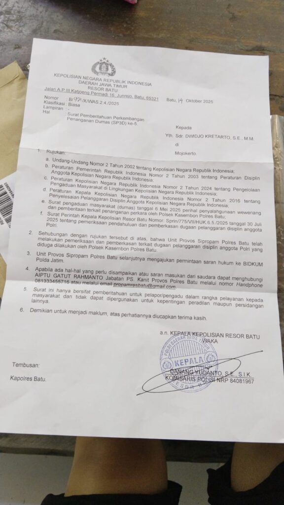 Proses penanganan dugaan pelanggaran disiplin yang menyeret anggota Polsek Kasembon, Polres Batu, hingga kini masih mandek tanpa kepastian hukum yang jelas. Fakta ini terungkap lewat Surat Pemberitahuan Perkembangan Penanganan Dumas (SP3D) ke-5 yang diterbitkan oleh Kepolisian Negara Republik Indonesia Daerah Jawa Timur, Resor Batu, bernomor B/921/X/WAS.2.4/2025, tertanggal 14 Oktober 2025.