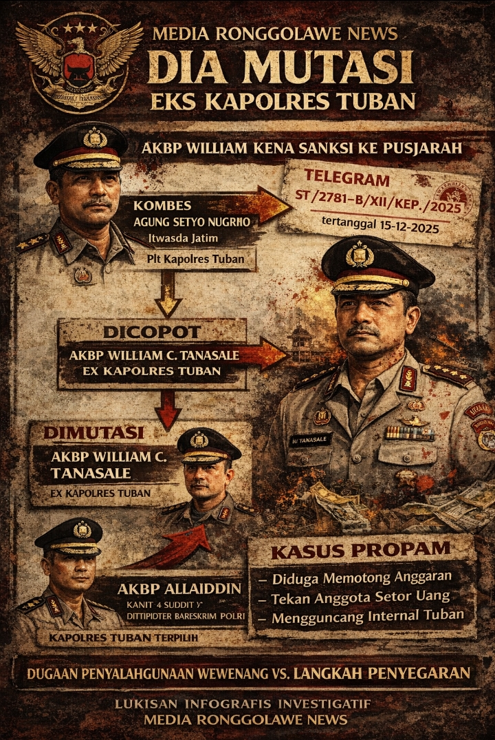 Mutasi besar di jajaran Polda Jawa Timur kembali menyentak publik. Salah satu nama yang menjadi sorotan adalah eks Kapolres Tuban AKBP William Cornelis Tanasale, yang resmi dipindahkan menjadi Perwira Menengah (Pamen) Pusat Sejarah Polri (Pusjarah Polri) melalui Telegram Rahasia Kapolri nomor ST/2781-B/XII/KEP./2025 tertanggal 15 Desember 2025.