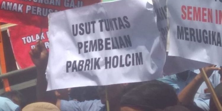 Dalam aksinya, mereka memampang spanduk besar dan membentuk sejumlah tulisan, diantaranya jangan lupakan jas merah, menolak sentralisasi perhitungan gaji anak perusahaan, dan yang paling ekstrim yaitu tulisan USUT TUNTAS PEMBELIAN PABRIK HOLCIM.